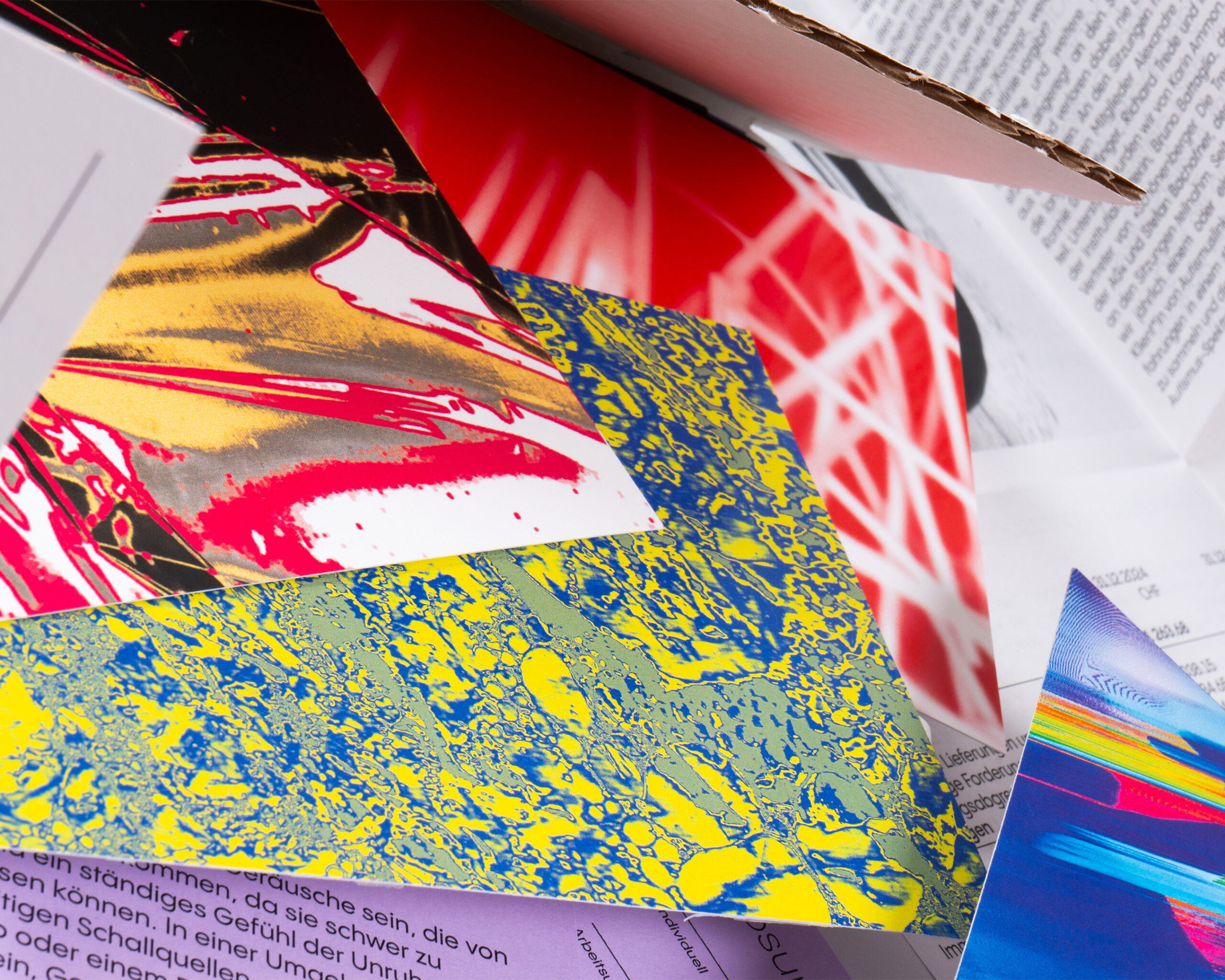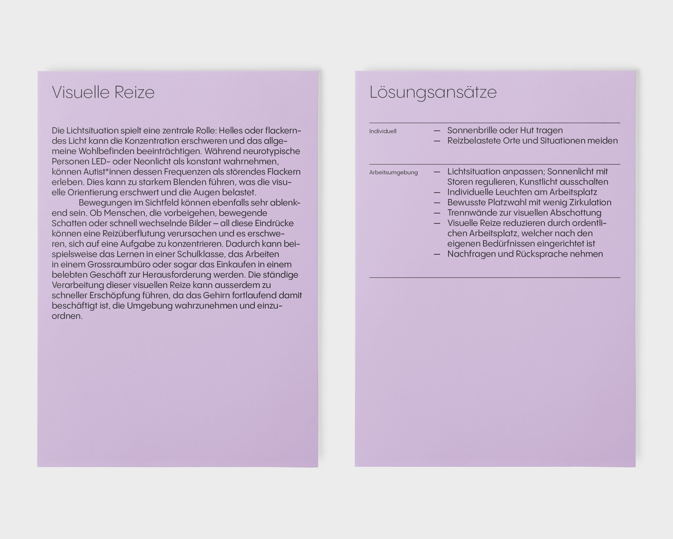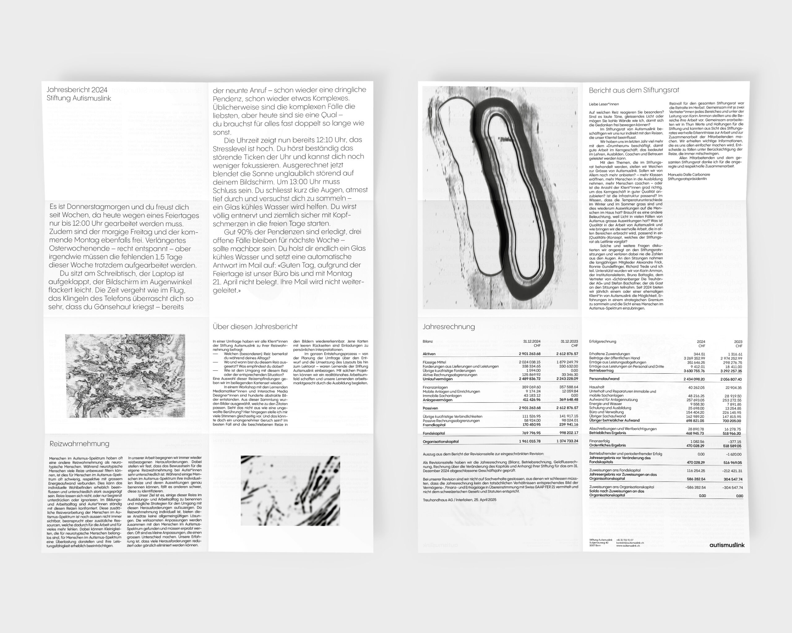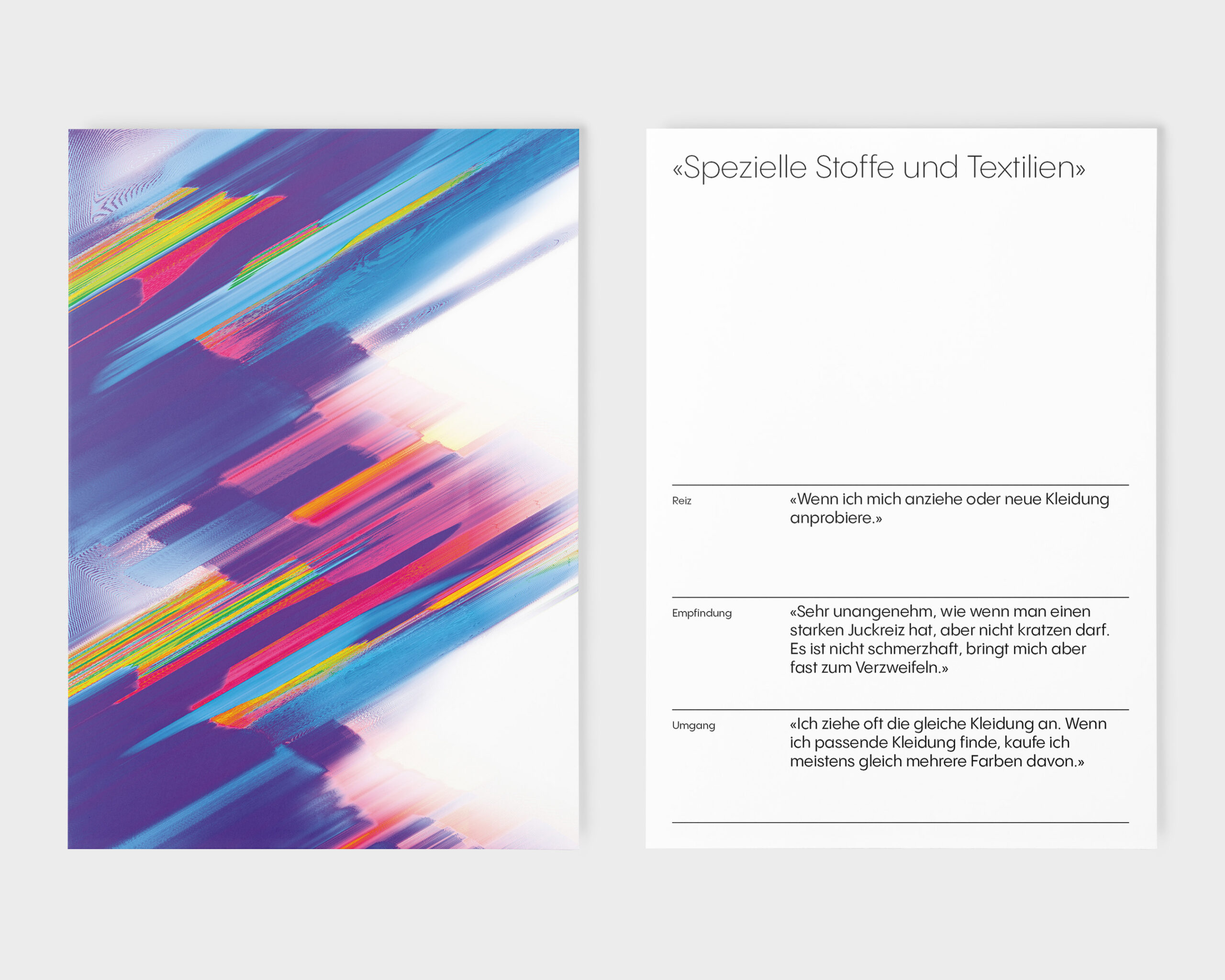 Für die Stiftung Autismuslink gestaltete ich den Jahresbericht für das Jahr 2024. Diesen habe ich zweiteilig umgesetzt. Ein Teil war der effektive Bericht mit Jahresabrechnung und Bericht des Stiftungsrats. Dieser wurde auf dünnes Papier gedruckt, damit er den Effekt einer Packungsbeilage erhält, wie man sie aus Medikamenten kennt. Der zweite Teil bestand aus Postkarten zum Thema Reize im Alltag. Diese hatten abstrakte Motive auf der Vorderseite, die den Reiz visuell darstellen sollen, der auf der Rückseite beschrieben wird.