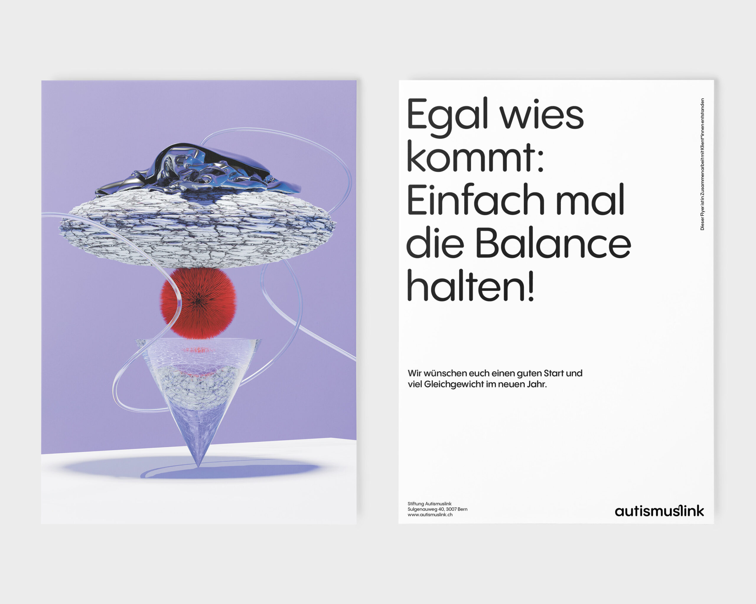Im Auftrag der Stiftung Autismuslink gestaltete ich Neujahrskarten zum Jahreswechsel 2024/2025. Thematisch standen Stabiles im Mittelpunkt. Mithilfe von Blender konnte ich dabei ohne physikalische Regeln und reale Schwerkraft arbeiten und so grosse oder schwere Objekte scheinbar mühelos von leichten Elementen ausbalancieren lassen. Als Endprodukt entstanden vier unterschiedliche Stabiles. Eines davon wurde für die effektiven Neujahrskarten verwendet, während die anderen drei als Serie auf Plakate gedruckt und im Nachhinein für die digitale Nutzung animiert wurden.