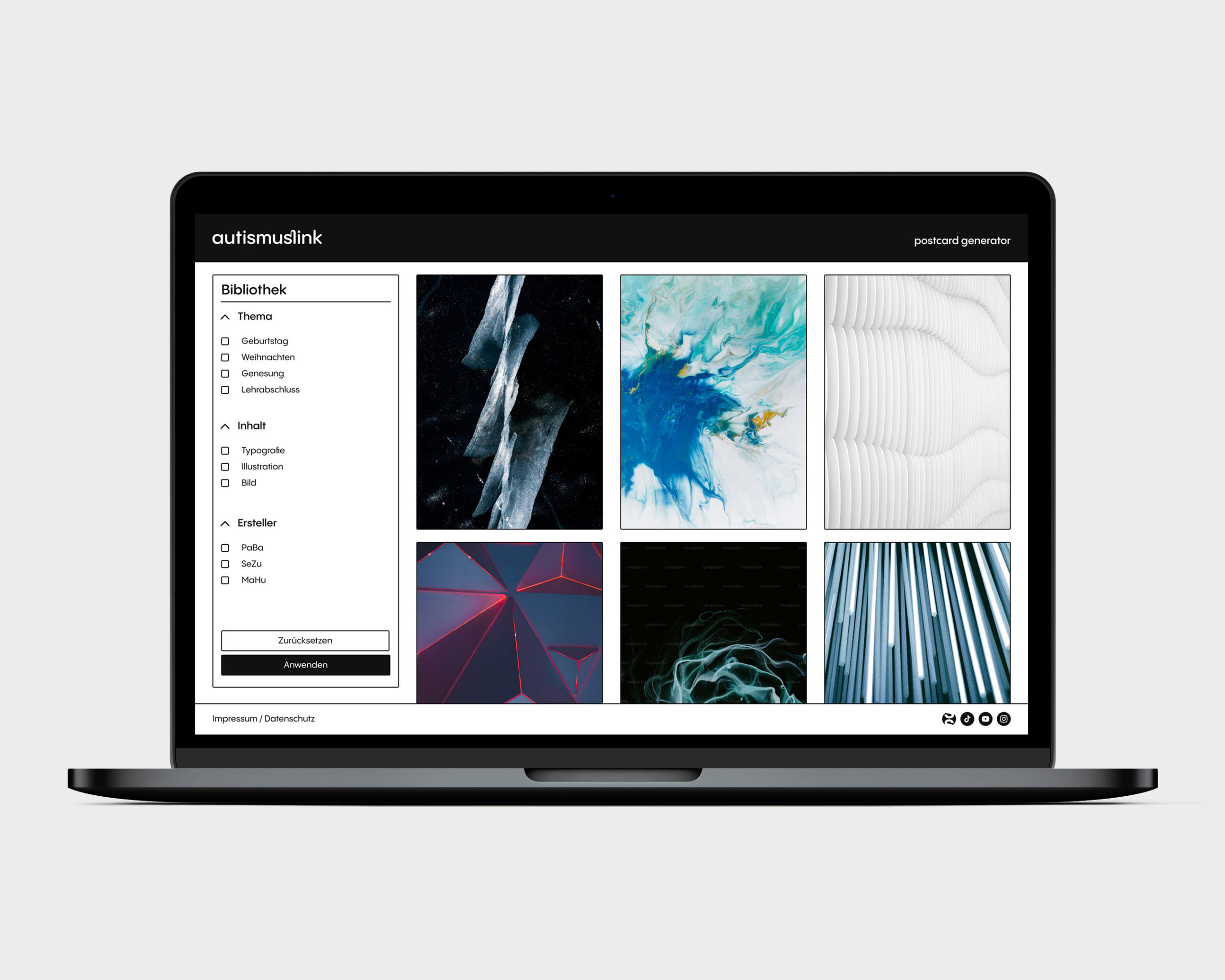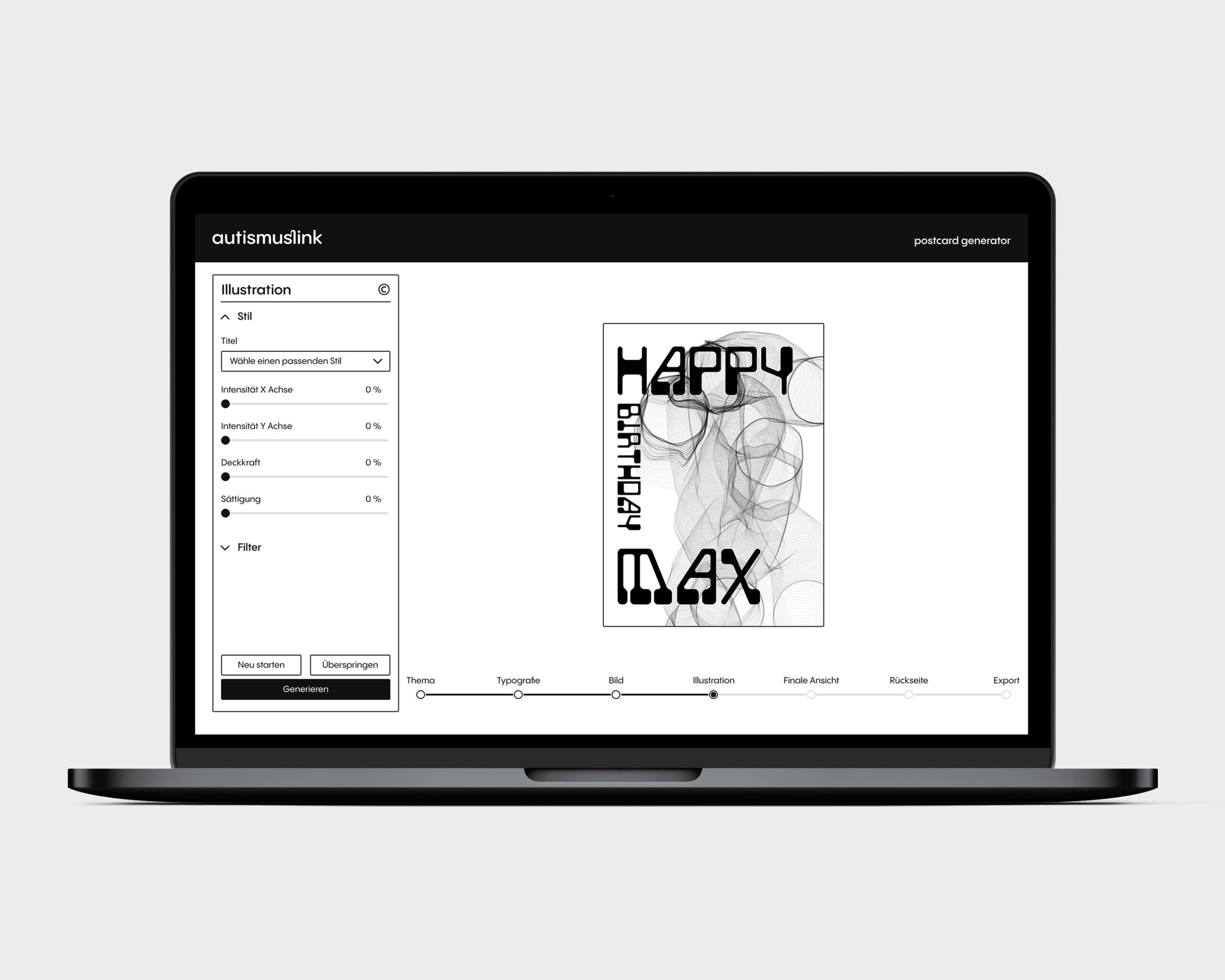 Im Auftrag der Stiftung Autismuslink konzipierte und gestaltete ich eine Applikation namens Postcard Generator. Die Anwendung wurde entwickelt, um Nutzerinnen und Nutzern eine einfache Möglichkeit zu bieten, personalisierte Postkarten zu generieren. Über einen klar strukturierten, schrittweisen Prozess können Motive generiert, Texte ergänzt und anschliessend fertige Postkarten erstellt werden. Der Fokus lag dabei auf dem generativen Prozess, bei dem bewusst auch ein gewisser Anteil dem Zufall überlassen wurde.